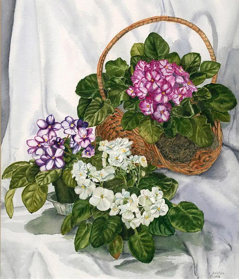 A gicleé print on fine art paper of an original watercolor. Three pots of African violets, one in a basket, with their velvety green leaves clustered against a white background.