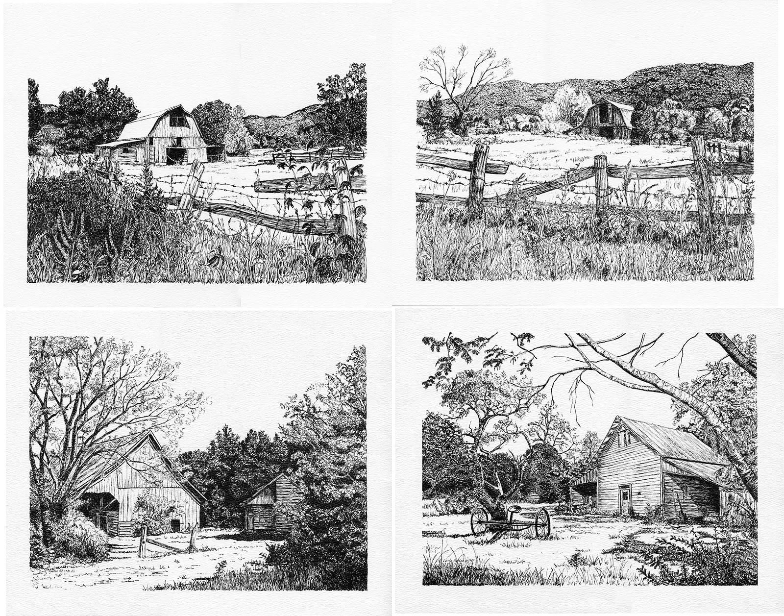 Four individual pen and ink drawings reproduced on fine art paper. Each 9″ x 12″ on 11″ x 14″ fine art paper. Sold as a set.