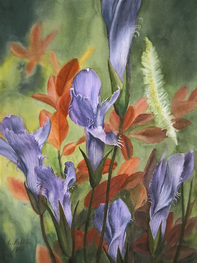 Gicleé print on fine art paper of an original watercolor. Fringed gentian blossoms in lavender with rust colored leaves a ans yellows and greens in the background.