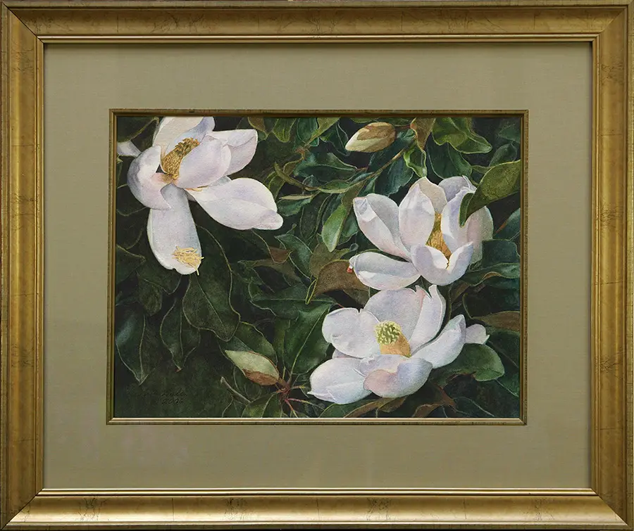 This original watercolor shows some of the beauty of magnolia blossoms. As fragrant as they are beautiful, magnolia blossoms express the elegance of the historical southern plantation, as well as the magnificence of the tree itself, peaceful, dignified, and so very lovely. This framed painting is priced at $1800.00.