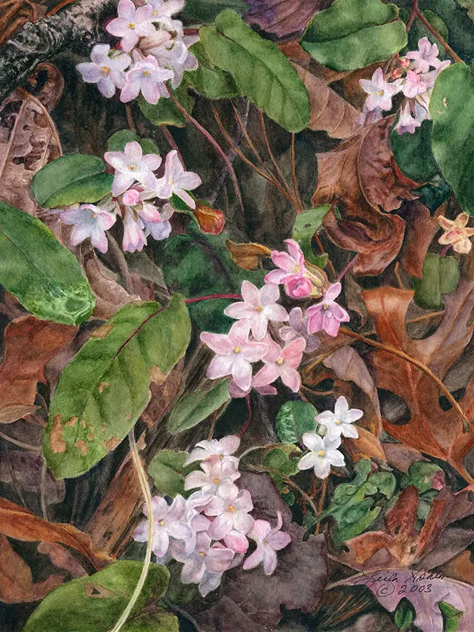 Trailing arbutus is a blossom of hope. It is the earliest flower to bloom in the spring, fragrant and very lovely. It is usually found along trails through hardwood forests, their floors layered with the winter’s oak leaves. The tiny blossoms are a delight to find after a long cold winter. Gicleé print archival matte paper. Price $60.00