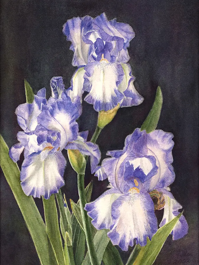 A gicleé print on fine art paper of an original watercolor. Three blue and white iris blossoms against a dark background.